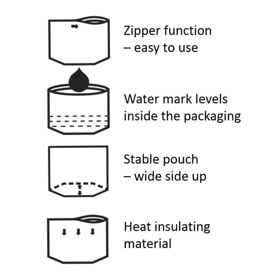 They taste great and could not be easier to prepare. All you have to do is simply fill the packet up to the indicated level mark on the inside of the packaging with hot or cold water. The award winning packaging is made from Flextrus Transofoil®, which is both fully recyclable as a plastic and acts as an excellent insulator, helping keep your meal hotter for longer.
