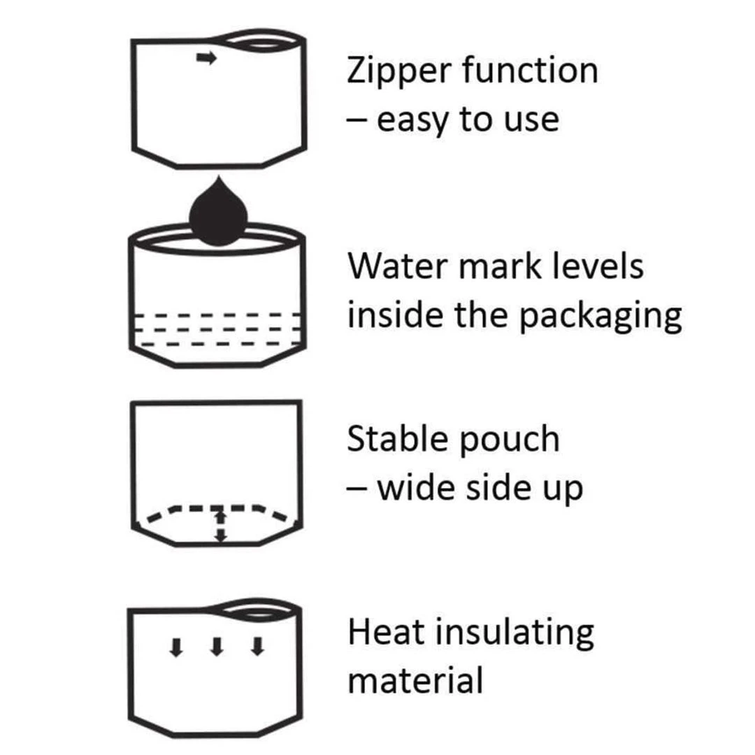 They taste great and could not be easier to prepare. All you have to do is simply fill the packet up to the indicated level mark on the inside of the packaging with hot or cold water. The award winning packaging is made from Flextrus Transofoil®, which is both fully recyclable as a plastic and acts as an excellent insulator, helping keep your meal hotter for longer.