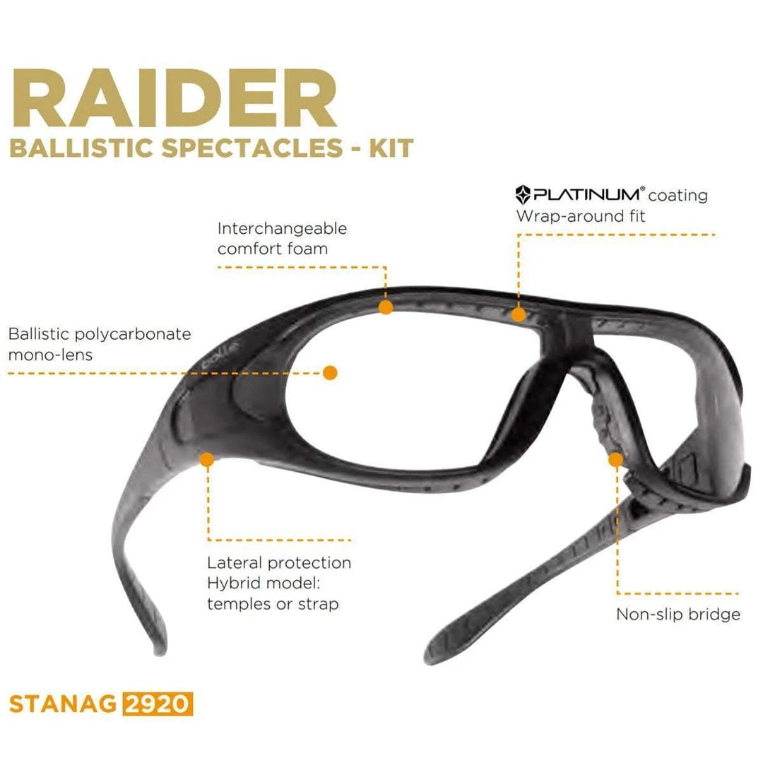 The Raider glasses by Bolle Tactical offer excellent levels of protection, with a rating of STANAG 2920, making them ideal for military, police or security use but also airsoft, hunting and most other outdoor sports. Versatility is something that the Raider is not short on either; Their interchangeable lenses means that you can adapt them to meeting all lighting conditions and the option to select between arms or head strap makes them a must. Supplied as a complete kit including 3 interchangeable lenses (smoke, clear & yellow), temple arms & headband all stored in a rigid case.