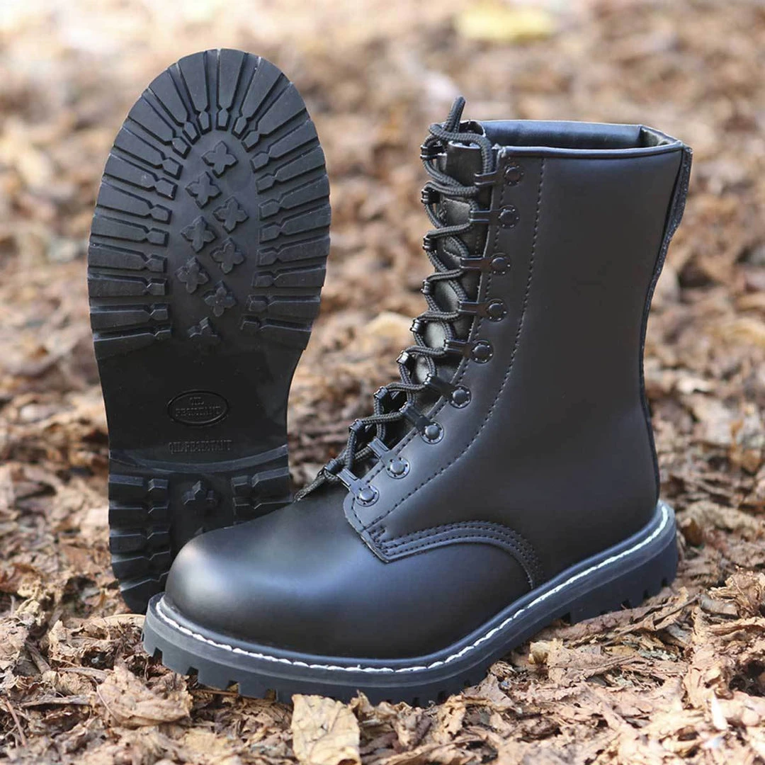 The Paratrooper Steel Toe Combat Boots by Brandit have been created in a classic style with a full leather construction for easy maintenance and added durability. Safety is also not an issue thanks to the steel toe cap. Other features include a 9-eyelet speed lace system and an oil resistant non-slip rubber outsole.