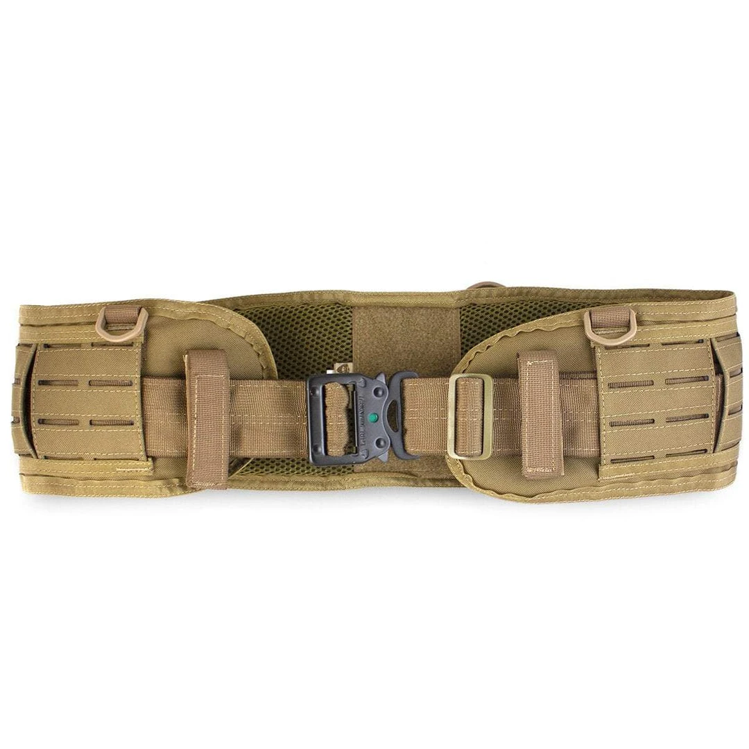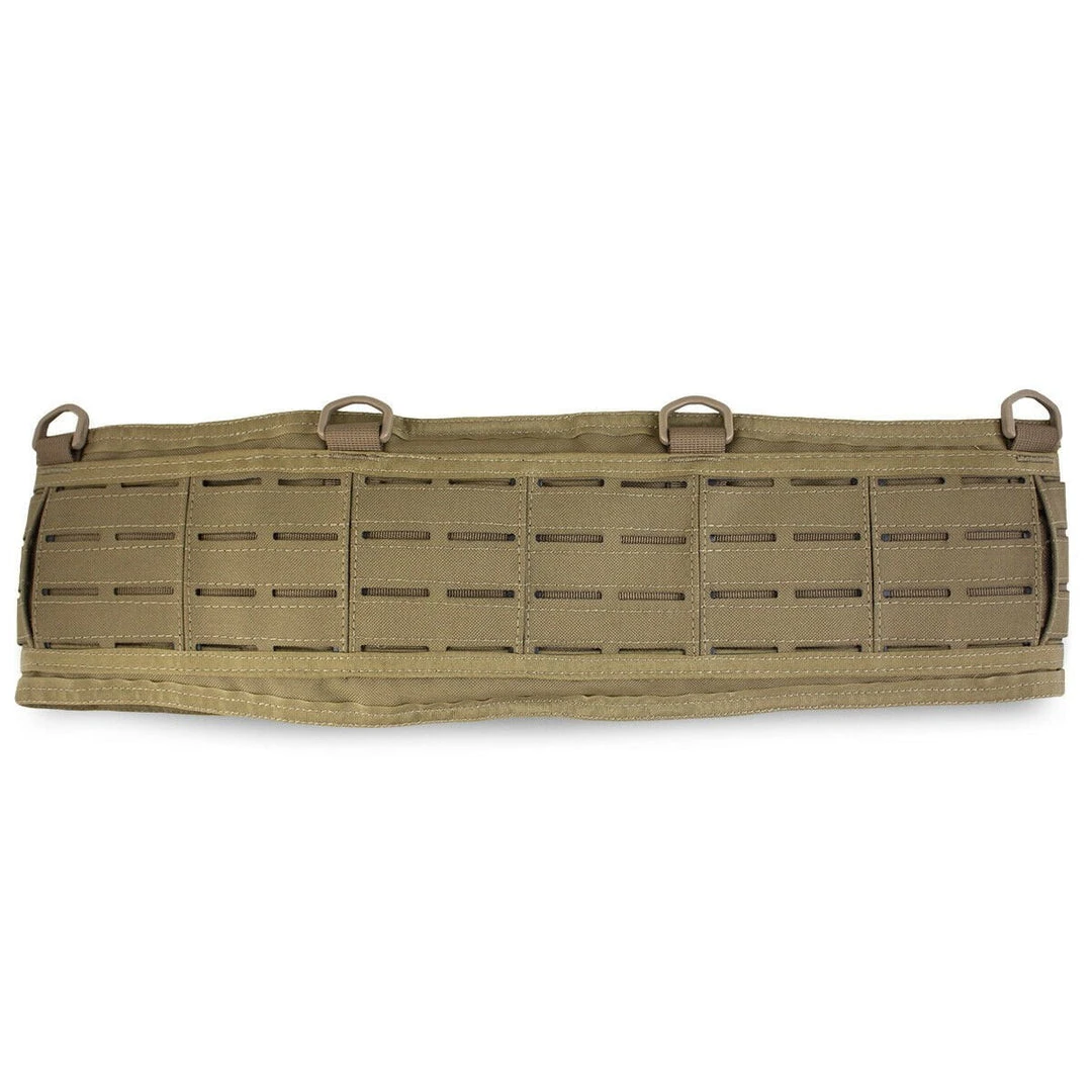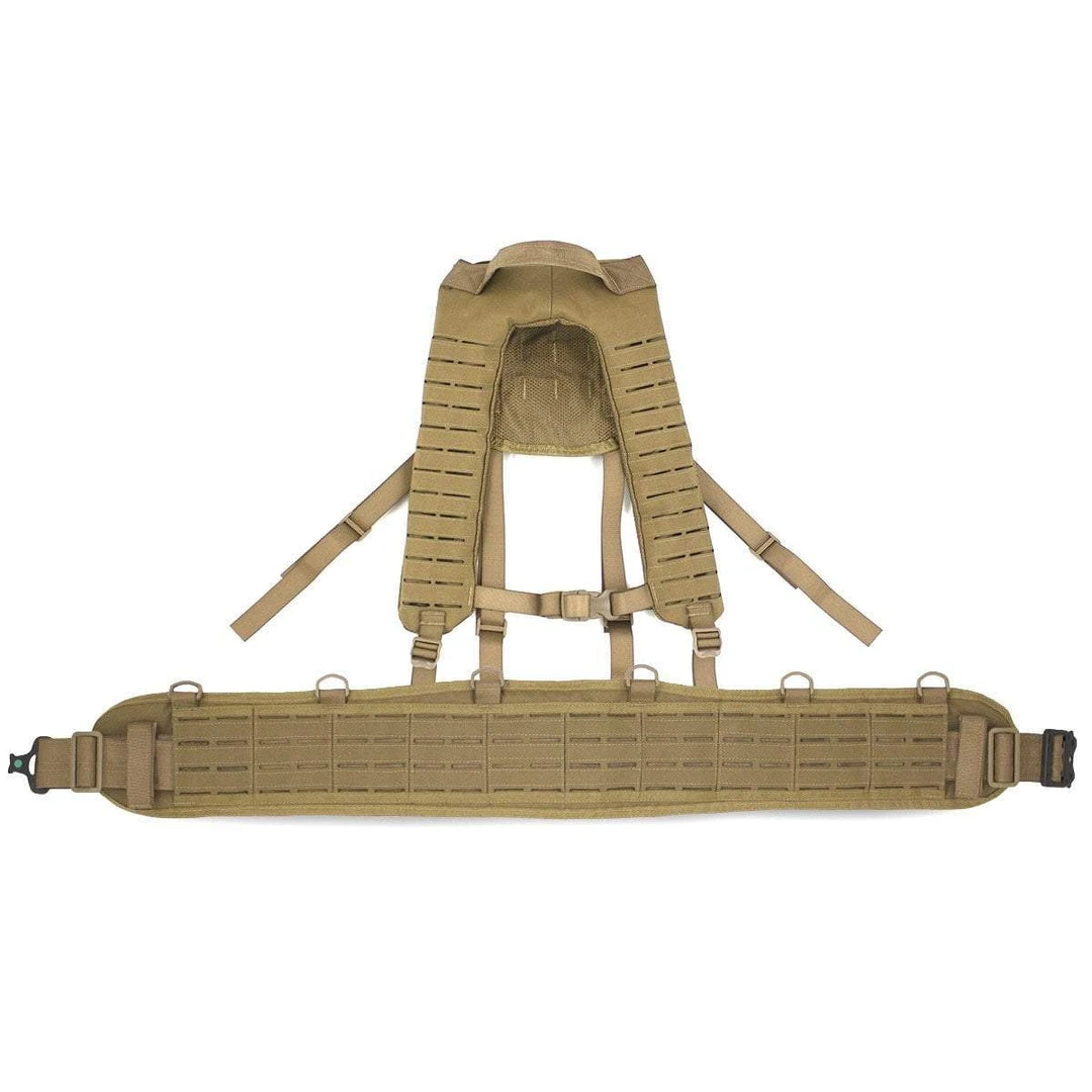 A laser cut MOLLE webbing set with a slotted MOLLE belt and MOLLE webbing yoke