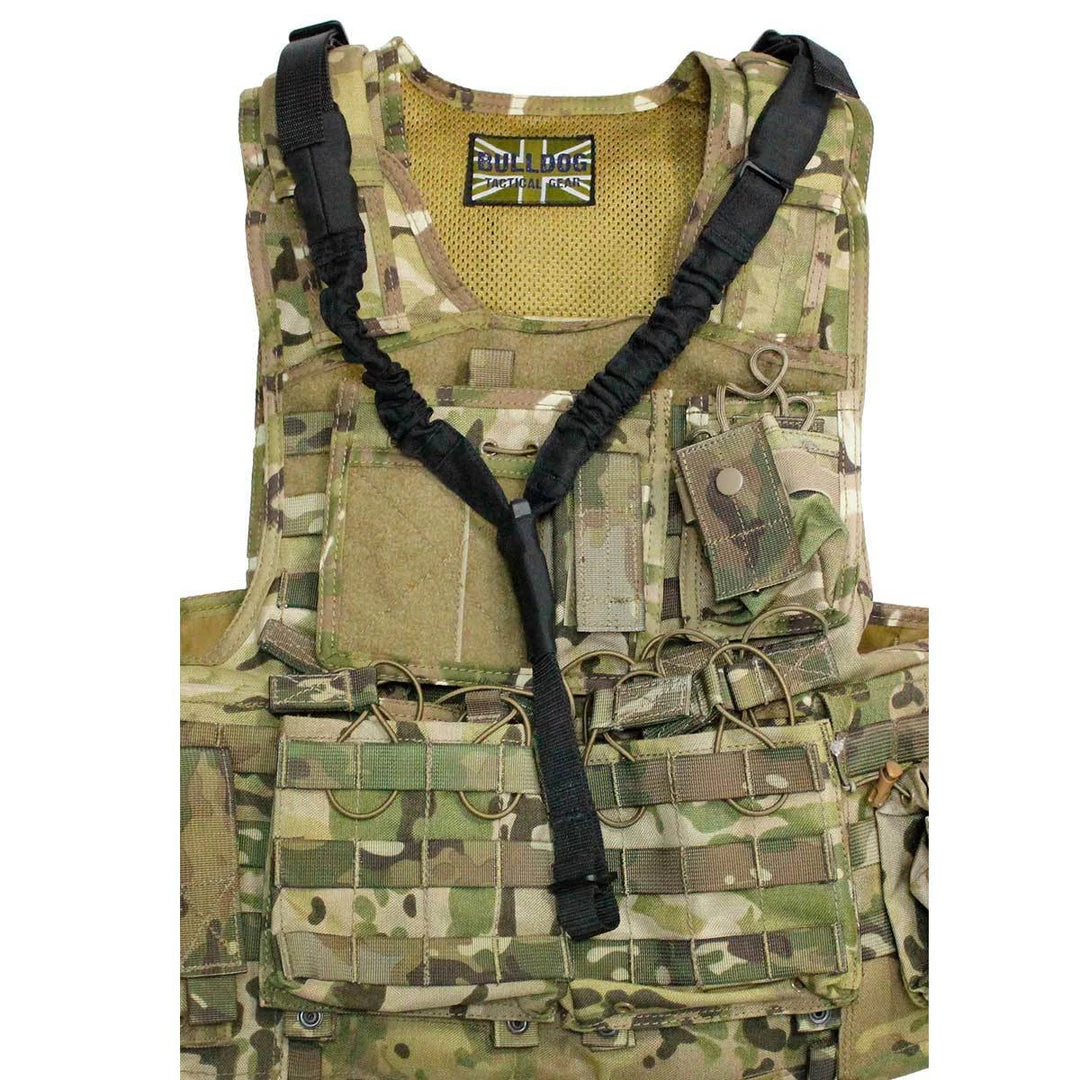 The Bulldog V Weapon Sling is only usable with plate carriers, chest rigs and vests; Attaches the top of the shoulders via D-Rings/loops. Provides a very simple yet highly effective sling with no straps around the neck to get in the way and restrict movement. It also removes the weight of the weapon from your neck, increasing comfort when used for long periods of time.