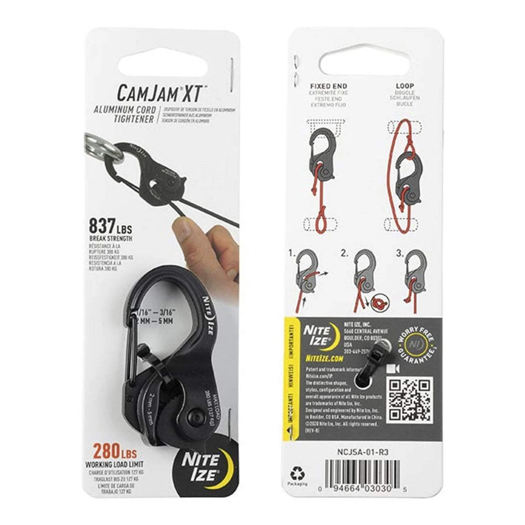 The CamJam XT Aluminum Cord Tightener features Nite Ize signature knot-free CamJam tightening and tensioning technology. Built from durable cast aluminum and available with 10 ft of premium paracord, this rugged combination of a carabiner and cam mechanism can tighten, tension, connect, and secure nearly any load.
