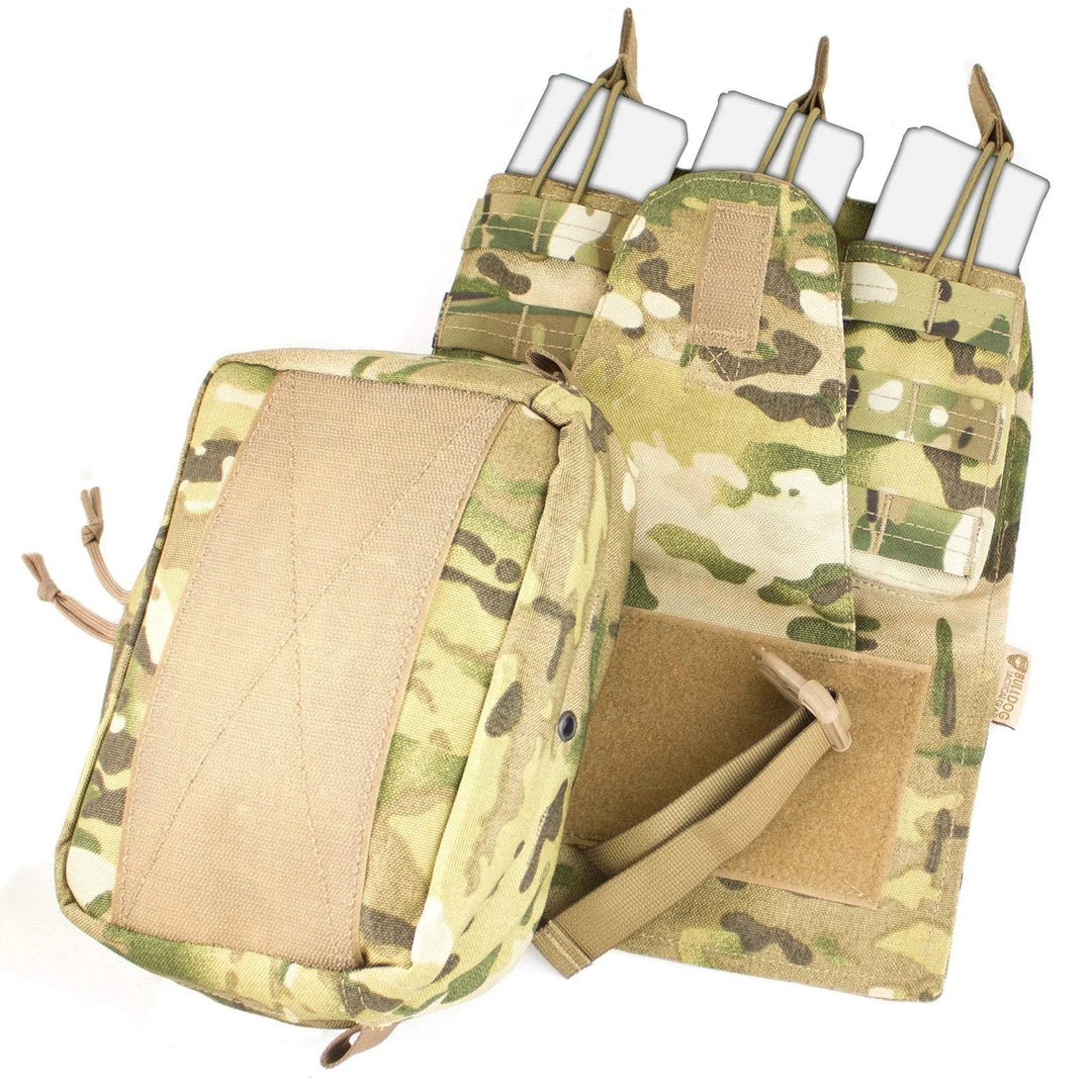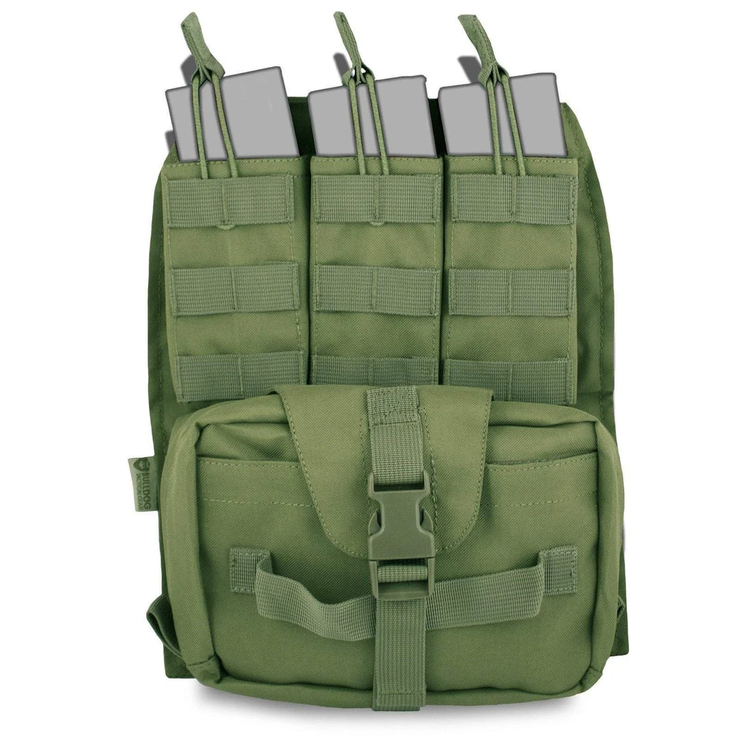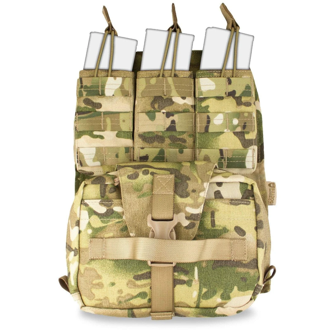 Designed to be mounted on to the back of the Bulldog Kinetic, Assault, or Mission Alert Plate Carriers but also compatible most other types too. Provides an integrated triple bungee mag pouch that holds three magazines, a tear-off utility/medic pouch and a compartment to store a hydration bladder (up to 3L).