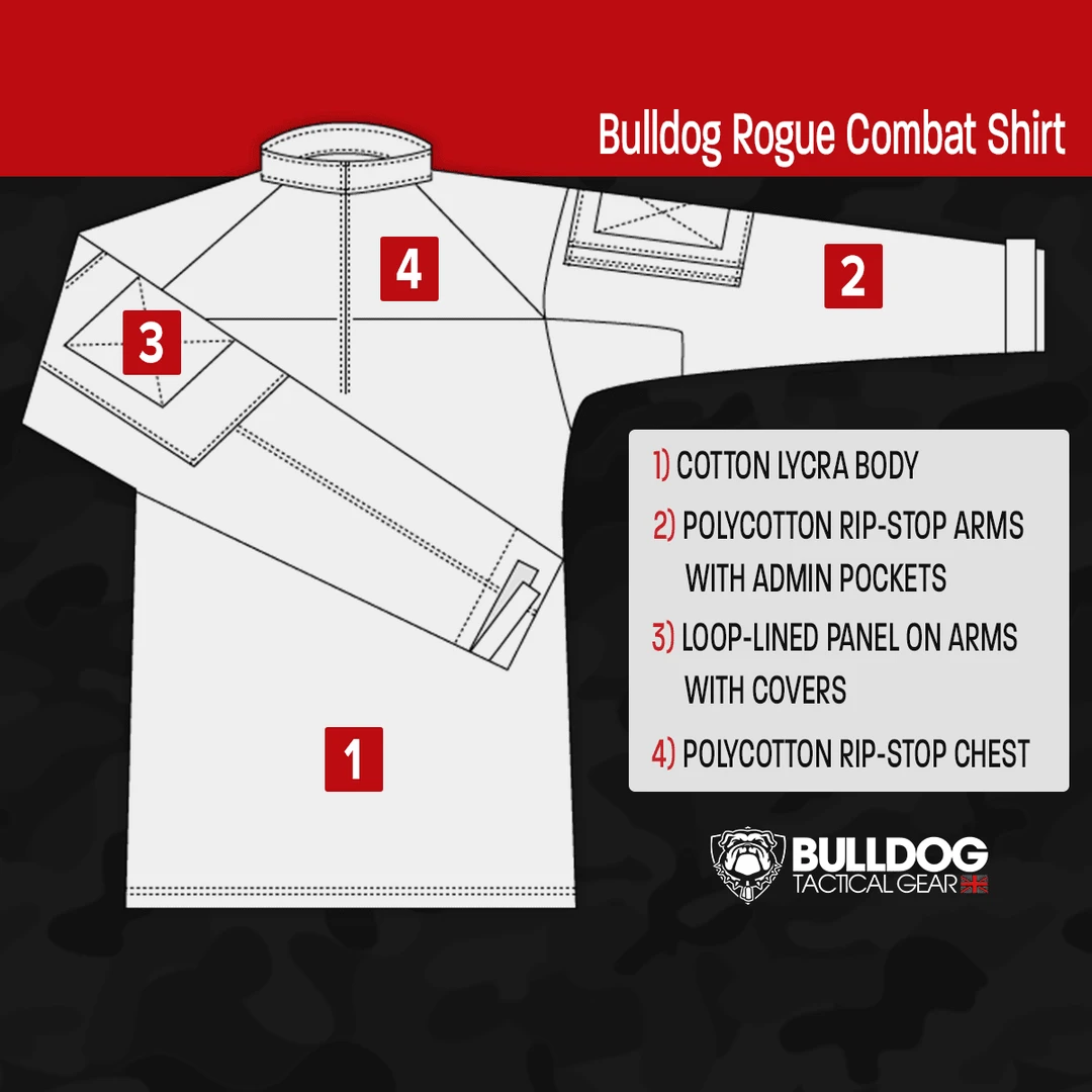 The Rogue Combat Shirt by Bulldog Tactical Gear has been created to provide a lightweight, ultra comfortable UBACS with sleeves that can be rolled up during hot weather. Designed for professional users and offers all the quality required for repeated field use; The arms are made from 65% Cotton & 35% Polyester rip-stop material and the body from 92% Cotton with 8% Elastane for increased comfort and performance. The Rogue UBACS offers a complete camouflage effect with matching body and arms plus Hook & Loop covers too. Admin pockets on both arms that offer storage for a notebook or similar sized items; Side zippered openings mean the pocket remains flat to the arm when empty.