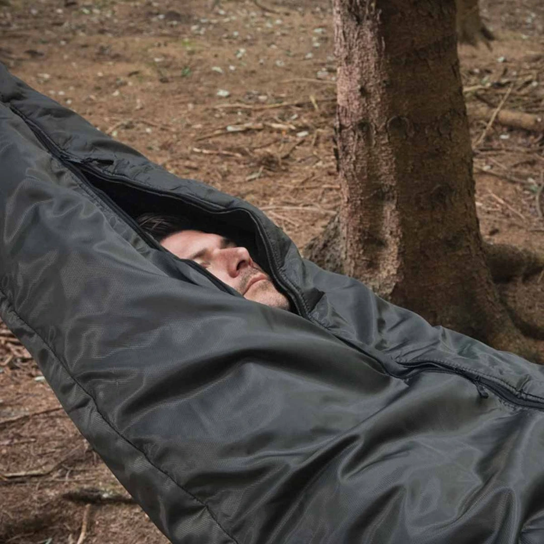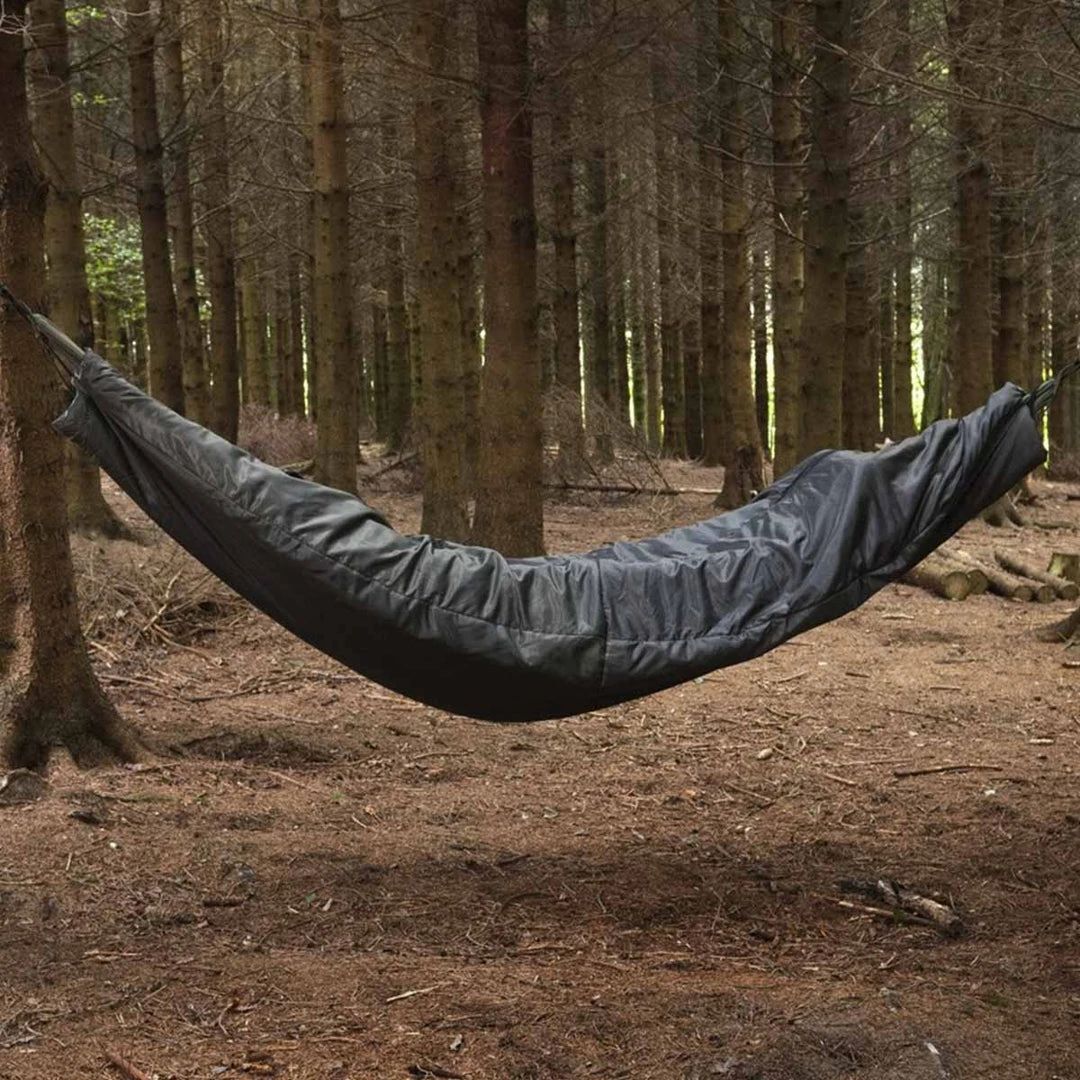 A novel solution to the problem of a sleeping bag and clothing insulation compressing under the tension from the hammock. This insulating layer fully encases the hammock (somewhat like a giant banana skin) trapping warm air both within the hammock, but also in its generous layer of insulation. The full-length zip allows for easy access in and out of your hammock.