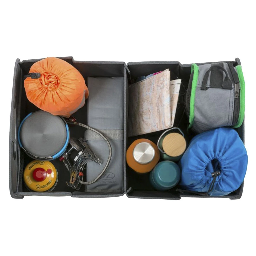 Foldable storage box for camping equipment at home or on the go. Keep your equipment organised and always ready to use. Great to have while glamping, staying in a chalet or in the van. Also perfect for organising kit in the garage or home cupboard.