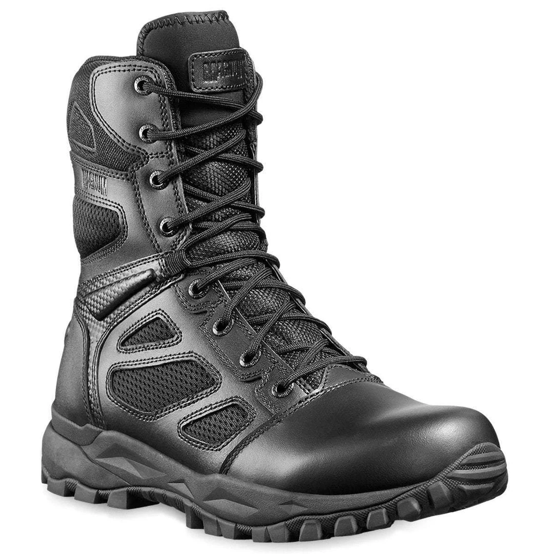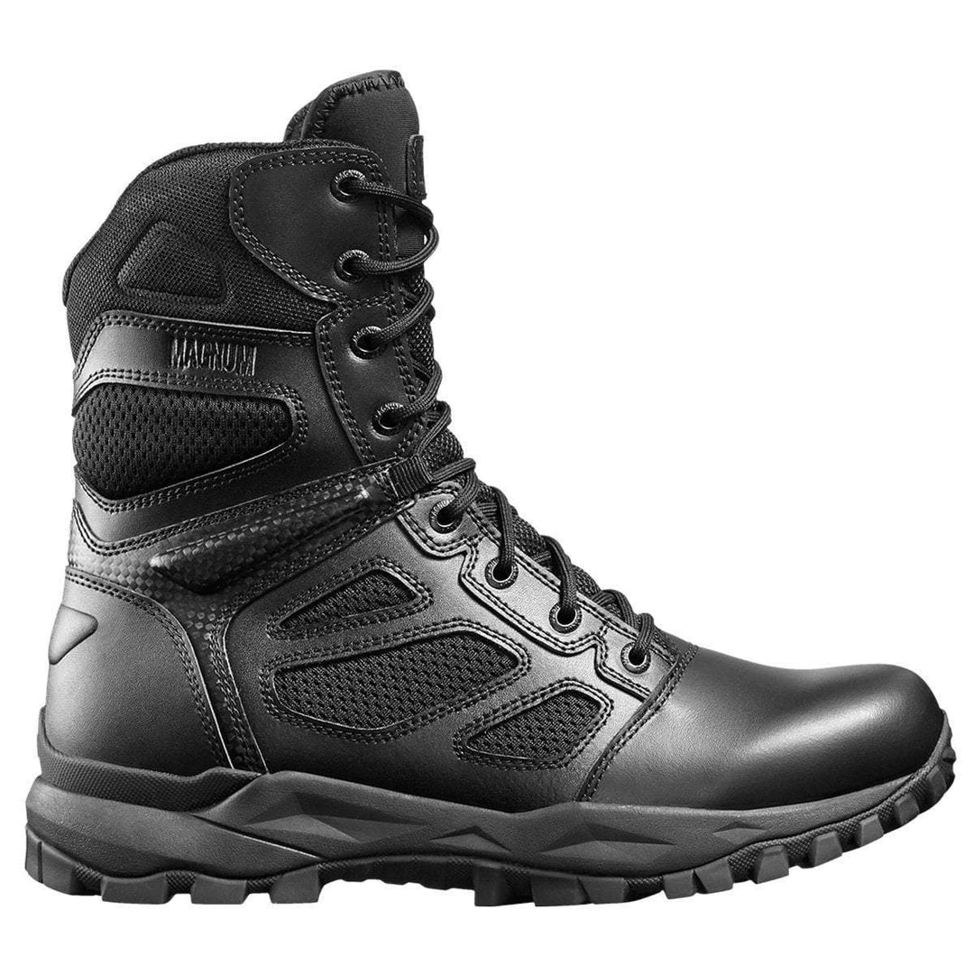 The Elite Spider X SZ tactical boots by Magnum are exceptionally breathable and comfortable uniform boots that do not come up short on style either. Featuring a durable leather upper with hard wearing breathable CORDURA® AFT 3D fabric air mesh vents and a fast wicking lining. Ideal for those who are active on their feet daily or prone to overheating. The straight YKK side zipper allows for easy access and all the hardware is rustproof and anti-glare. These tactical boots are exceptionally comfortable with a shock absorbing MPACT POWER insole and compression moulded shock absorbing RECOIL midsole proving all-day support and underfoot cushioning comfort.
