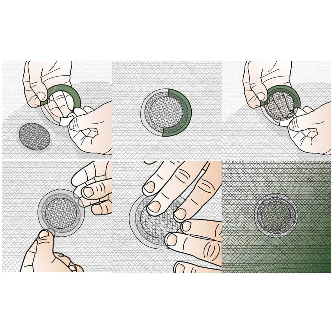 Suitable for instant emergency repairs to all types of mosquito nets, tent fly walls and house fly screens etc. The clear tape ring and the mosquito mesh patch will cover any small hole or tear up to 7 cm (2.76″). Just position the mesh, then peel and stick the tape ring – voilà ! The tape ring contains a powerful adhesive backing to ensure a good bond to the net but the ring is also removable without residue.
