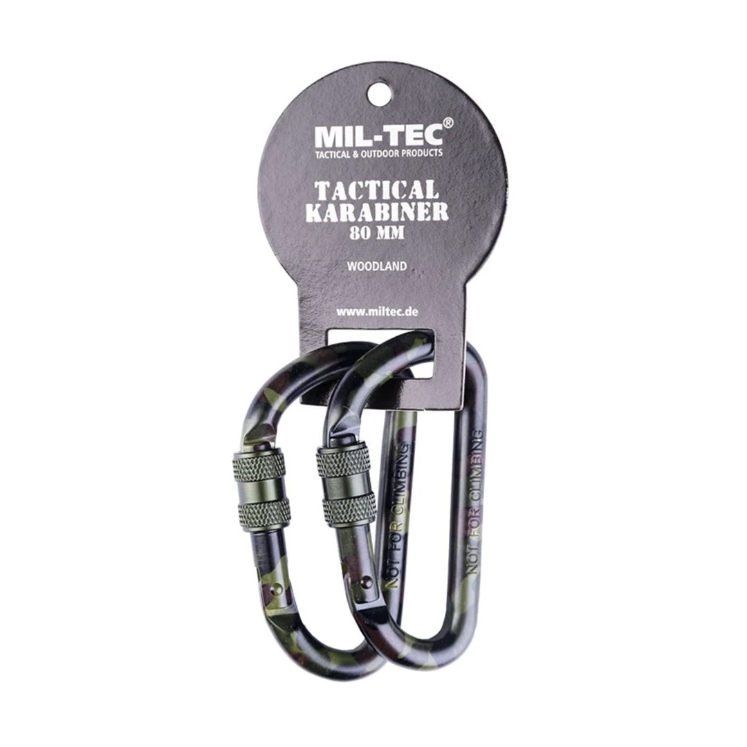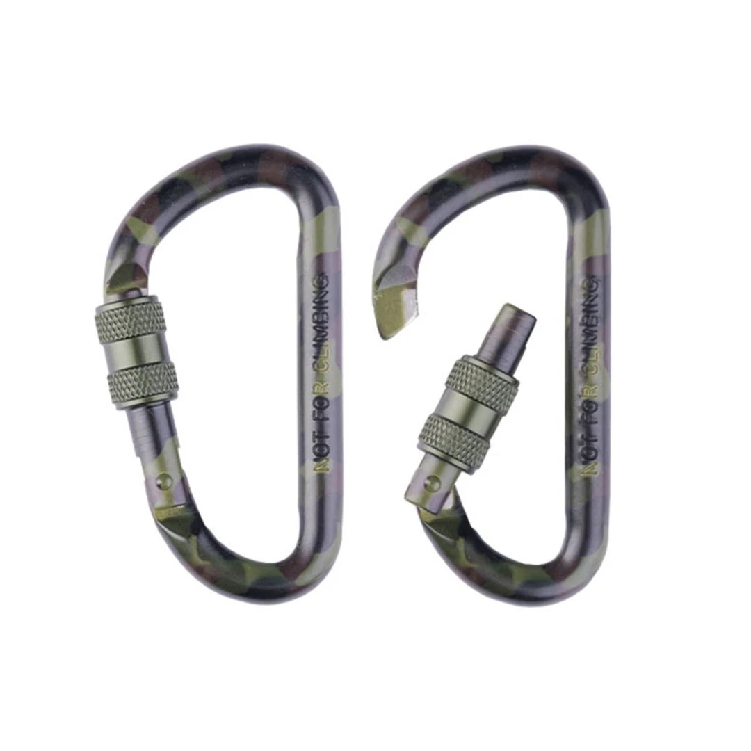 These handy carabiners are ideal for attaching gear to your belt or other equipment such as a rucksack or bag. The can be mounted on to MOLLE loops or other straps to form a point of attachment. The screw-lock gate offers complete security. Made from lightweight yet tough aluminium that is great for outdoor use with a woodland camo finish.
