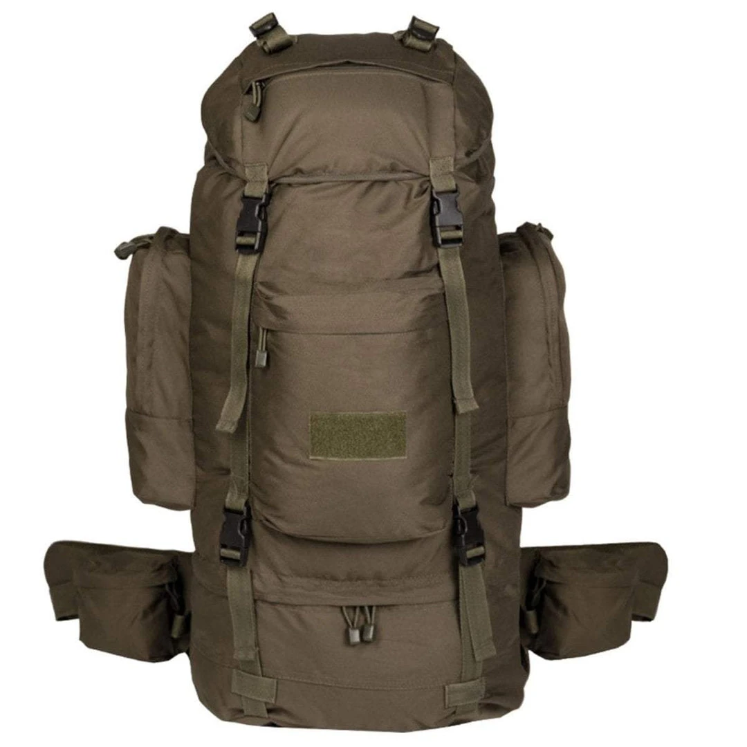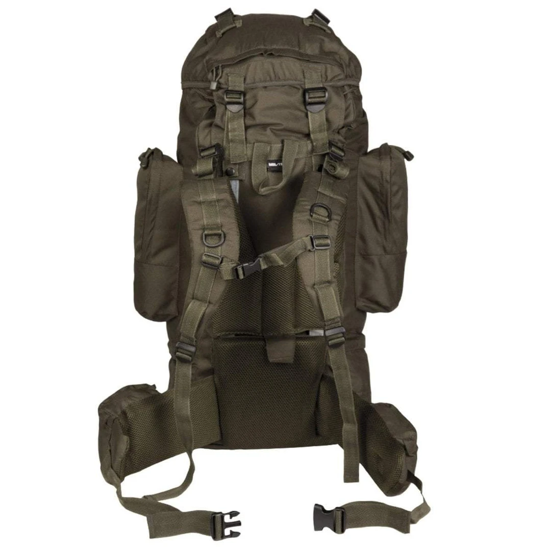 A military rucksack with 75 litre capacity, three external pockets and a padded waist belt with pouches
