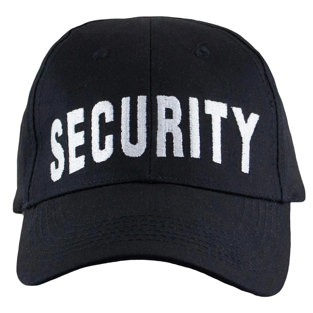 A black snapback baseball cap with SECURITY wordmark embroidered on the front