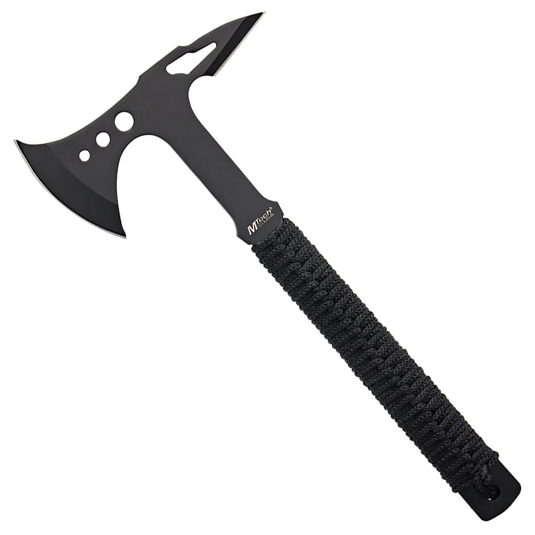 This Survival Hatchet by MTech USA is a highly versatile tool that is ideal for military or tactical use but will also be of interest for survival, hunting, camping and much more. Solid one-piece construction in 440 Steel, with a non-reflective black finish, ensures this tool can cope with intensive use. The handle is wrapped in paracord and can be removed to use in case of emergency. With a total length of 38.1cm, it is big enough for most tasks while still remaining compact enough to easily transport. Supplied with a nylon sheath to cover the head of the hatchet when not in use.