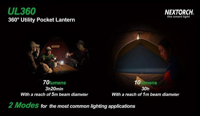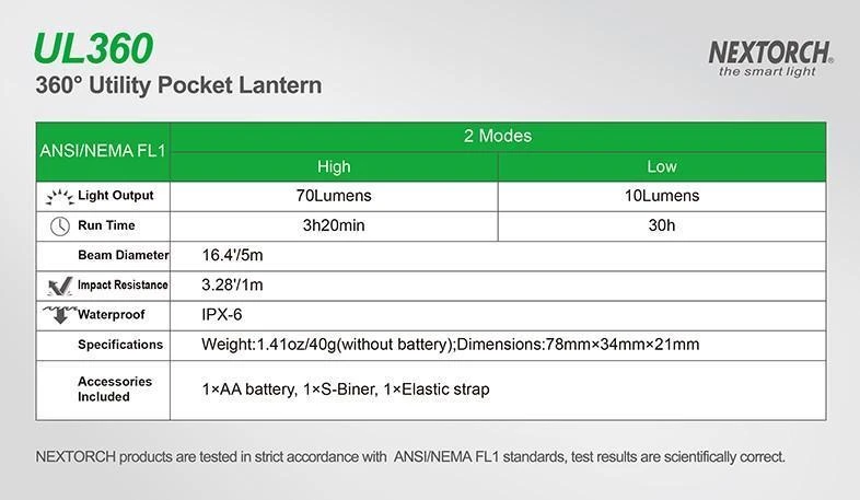 The UL360 is a 360° utility pocket lantern. It’s compact thumb-size, easy to carry and pack. The UL360 is driven by neutral white CREE® LED, more gentle and without hurting eyes during long use. Powered by one AA battery, max output up to 70 lumens, with a reach of 5 meters beam diameter. With 360-degree rotatable lamp body design, light in any direction you want, making most use of the light. Most interesting of all, UL360 comes with a magnetic bottom plate, a bungee cord and an S-biner, which offer countless mounting options that make UL360 fit in almost anywhere. The UL360 is the best choice for camping, outdoor activities, maintenance and emergency.