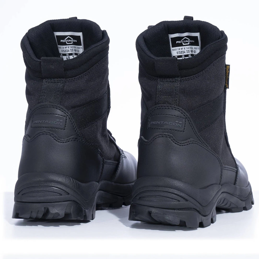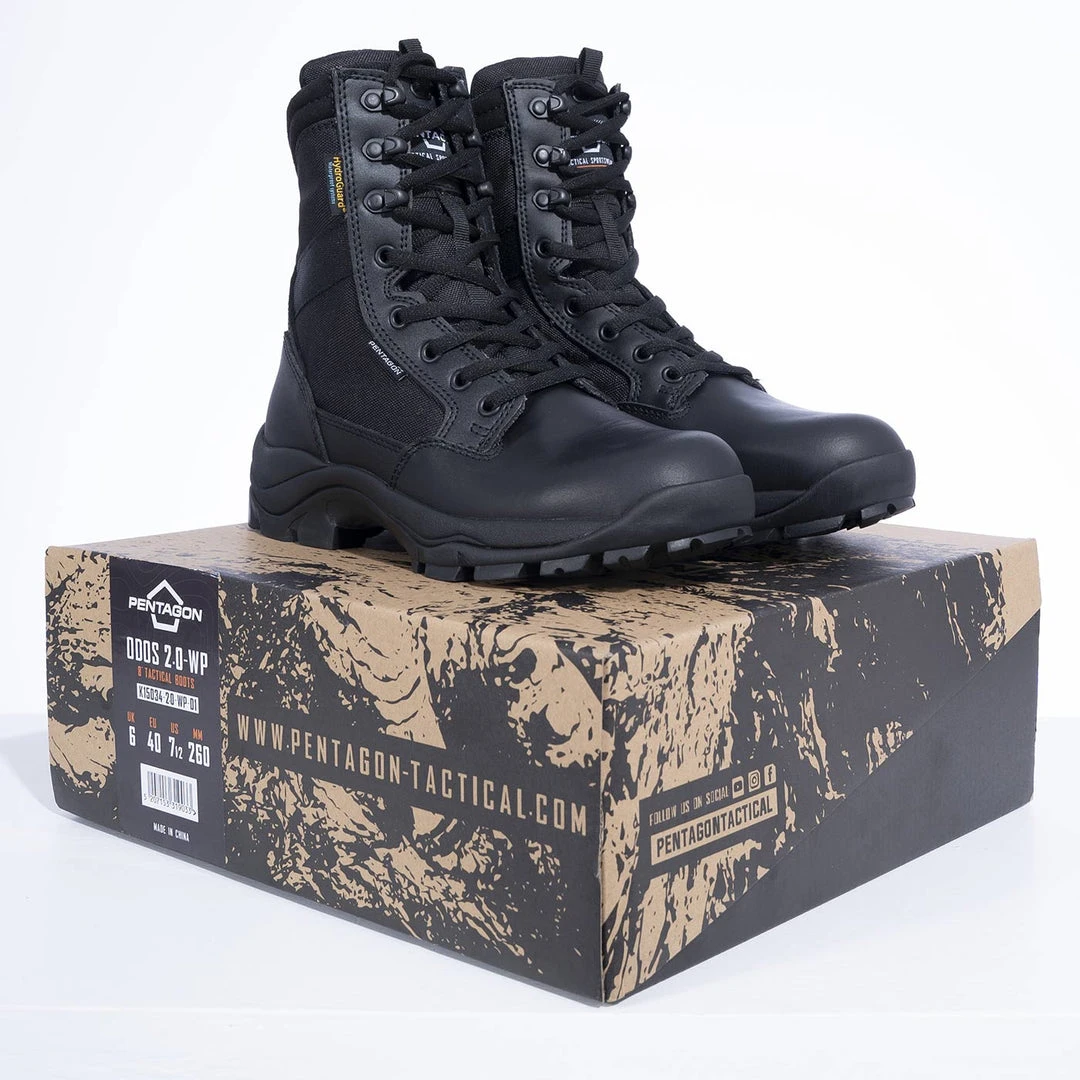 The Pentagon Odos 2.0 Tactical 8″ WP boots have been made for police or security professionals requiring a lightweight, waterproof fast-action tactical boot that can be used all year round. At 8 inches in height, these high cut men’s duty boots offer good levels of comfort while still providing excellent ankle support. The HydroGuard® waterproof lining ensures that your feet are protected against the elements but the Nylon panels still allow warm air to leave the boot and cooler air to enter. High-quality First Leather used throughout the construction means that performance will not be an issue and your boots will stay looking at Uniform standard for longer.