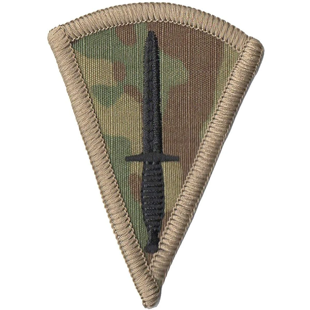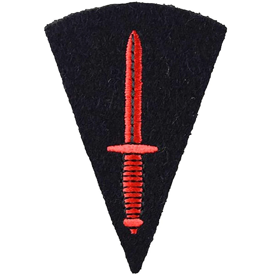 - Official Description: Badge Qualification. Army. Commando-Trained, Officers and Soldiers. Cloth. Embroidered.Red on dark blue. Field service fighting knife.