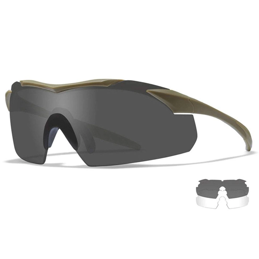 Ballistic glasses with a tan frame, MIL-PRF-32432(GL) safety rating and two interchangeable lenses